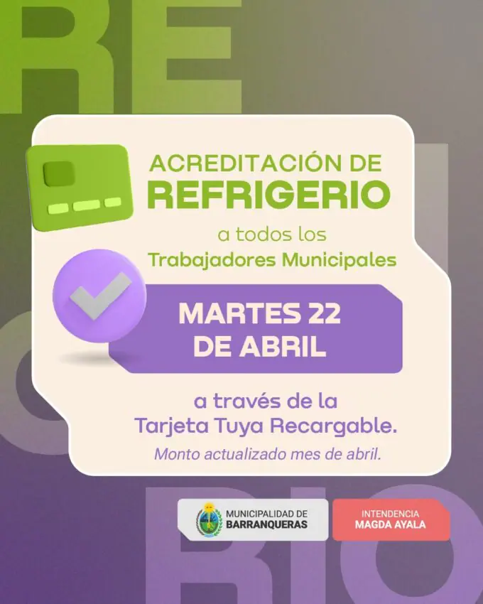 El municipio de Barranqueras informa que hoy 22 de abril se acreditará el refrigerio para todos la administración municipal, con el incremento en este concepto del 25% que corresponde al mes de abril.Â
