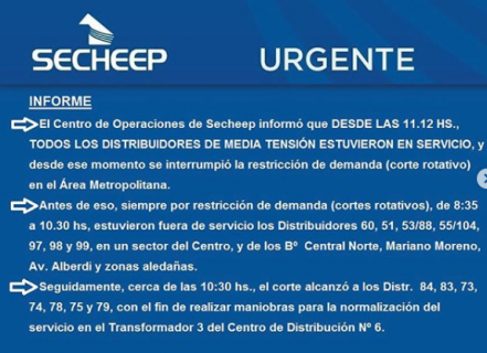 El Centro de Operaciones de Secheep informó que desde las 11.12 hs, todos los distribuidores de media tensión estuvieron en servicio, y desde ese momento se interrumpió la restricción de demanda (corte rotativo) en el Área Metropolitana.