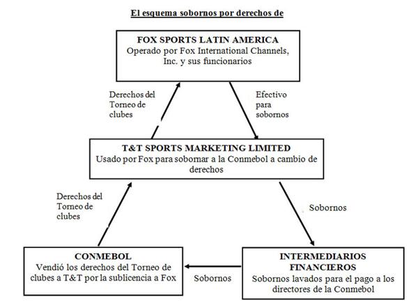 Y el presunto flujo de sobornos desde Fox a la Conmebol a cambio de los derechos exclusivos de los torneos más importantes del continente fue descripto con este gráfico: